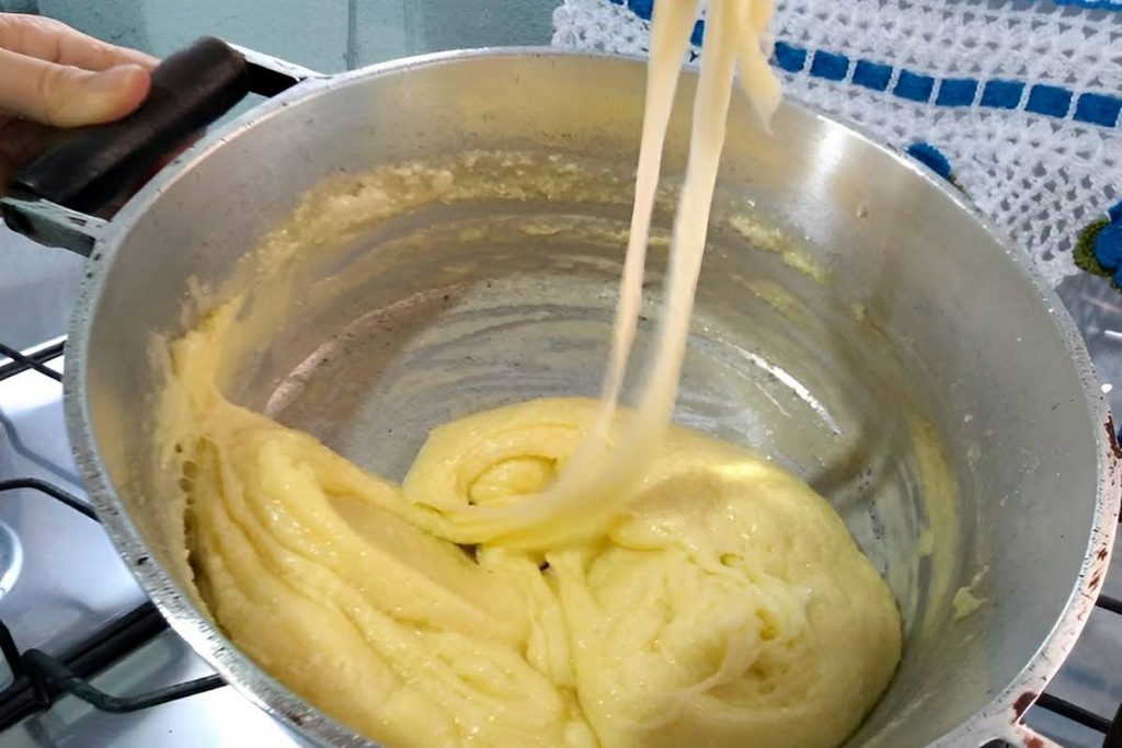 - Coloque a tapioca granulada em uma tigela e despeje o leite quente por cima. misture bem e deixe hidratar por 10 minutos. Acrescente os ovos, o açúcar e a manteiga. misture até formar uma massa homogênea. Adicione o queijo ralado e mexa delicadamente para distribuir bem na massa. Por último, incorpore o fermento em pó, misturando suavemente.