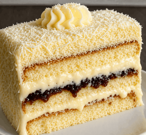 1. Corte o bolo ao meio, recheie com o creme de coco com ameixa.