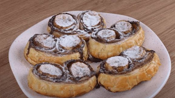 - Abra a massa folhada e espalhe o creme de avelã por toda a superfície, formando uma camada fina.