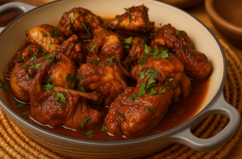 Em uma panela grande, adicione o óleo e o açúcar. Deixe o açúcar caramelizar levemente e, em seguida, acrescente o frango temperado. Deixe dourar bem de todos os lados. Essa etapa é essencial para garantir o sabor marcante da receita.