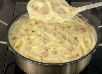 - E o macarrão ao creme de batata mais delicioso do mundo ficou pronto!