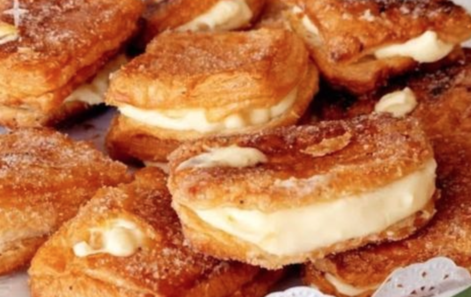 Em seguida, coloque uma colher de creme de confeiteiro no centro de um retângulo de massa, coloque outro por cima e feche, primeiro com os dedos e depois com um garfo.