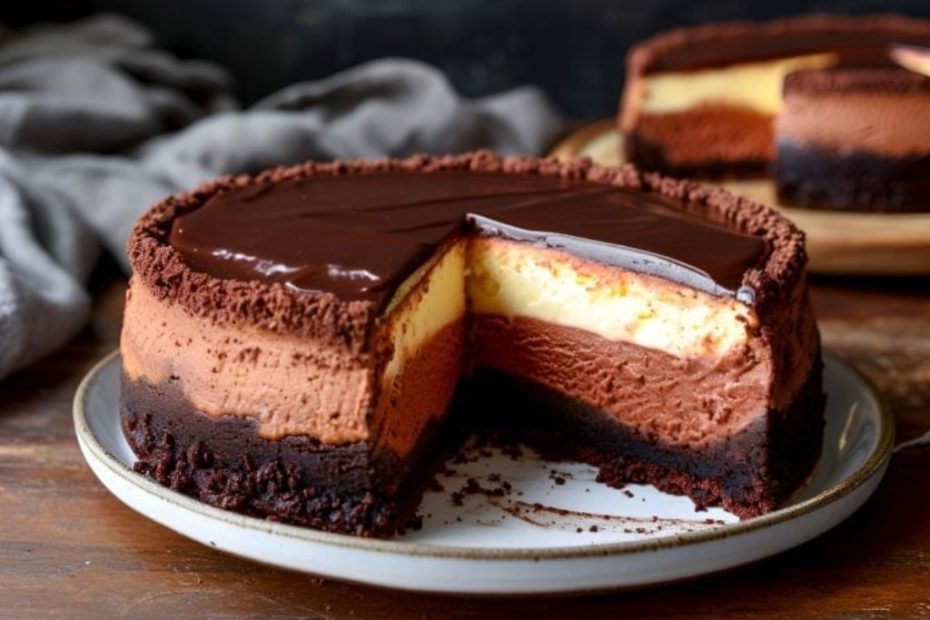 - Antes de despejar esta camada, raspe levemente a superfície da camada de chocolate meio amargo com um garfo para melhorar a aderência. Despeje cuidadosamente e deixe firmar.
